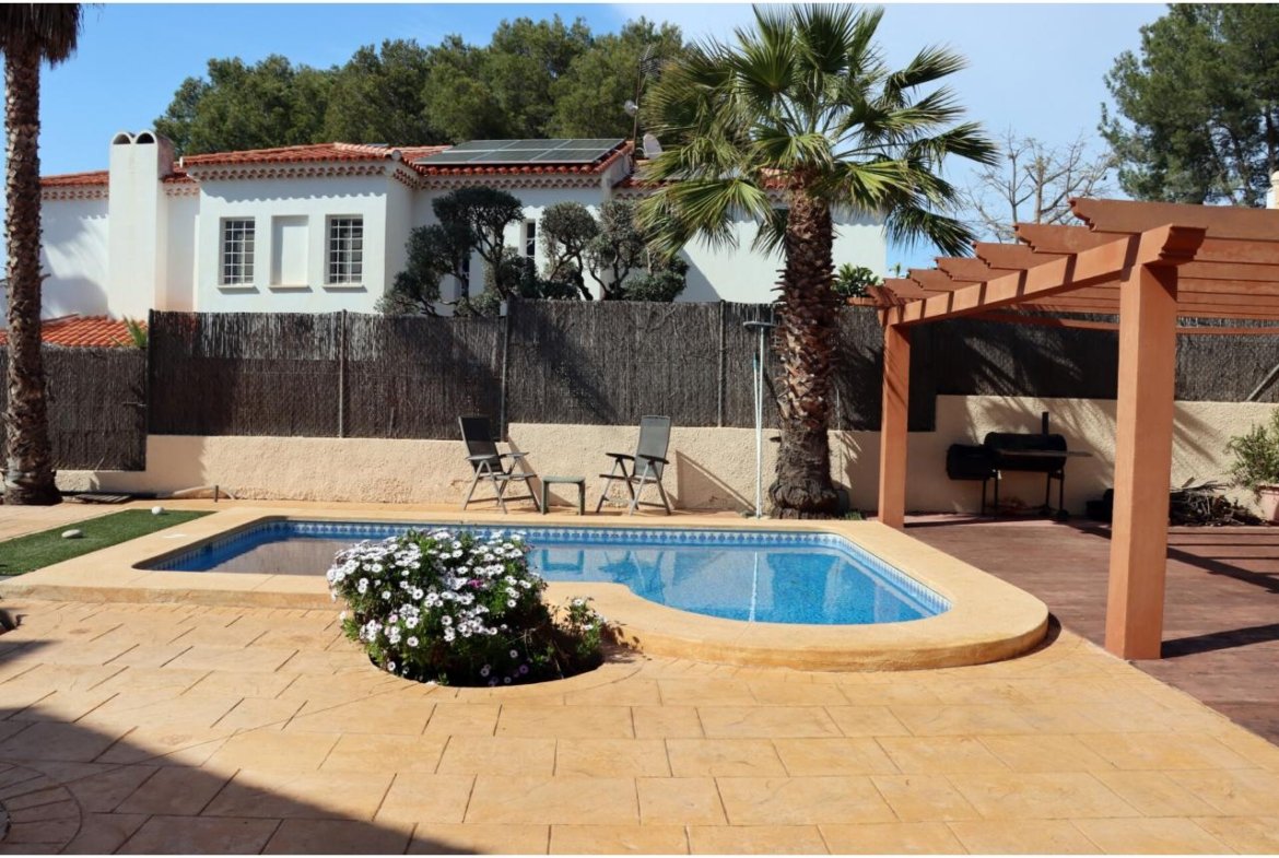 Exteriorul proprietății este complet echipat pentru a vă bucura de clima mediteraneeană, oferind o piscină privată, o pergolă, un patio mare și o zonă cu pomi fructiferi. Siguranța este garantată de ușa blindată și grilajele de securitate. Proprietatea include și un spațiu pentru parcare (garaj pentru 2 mașini).